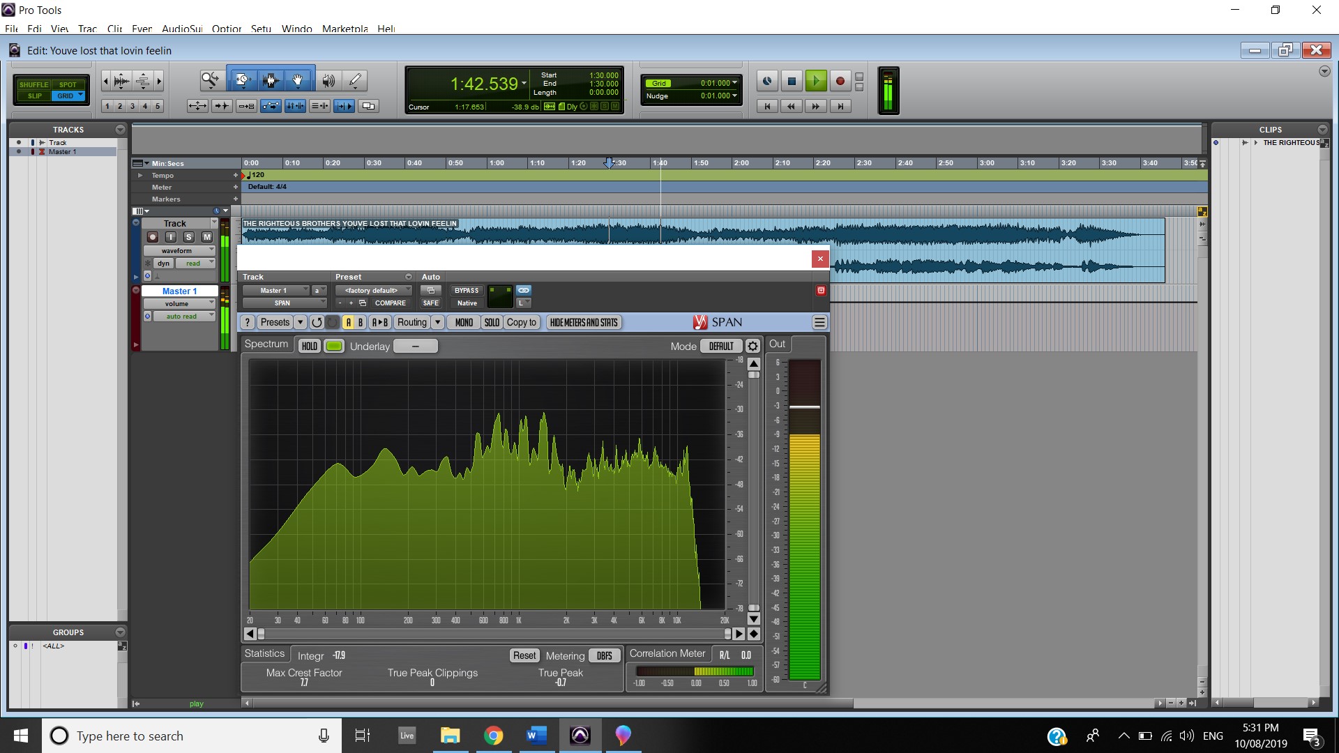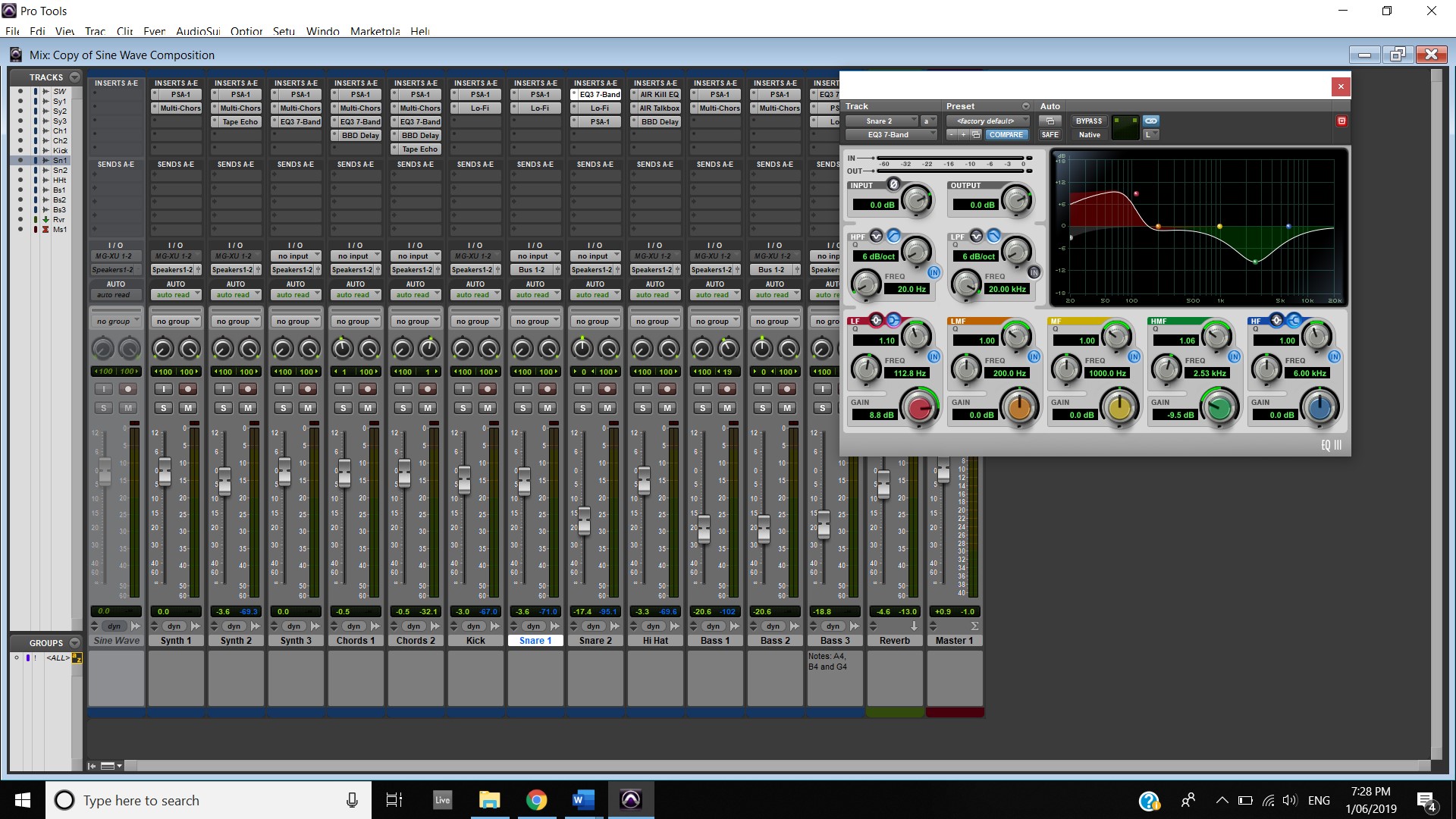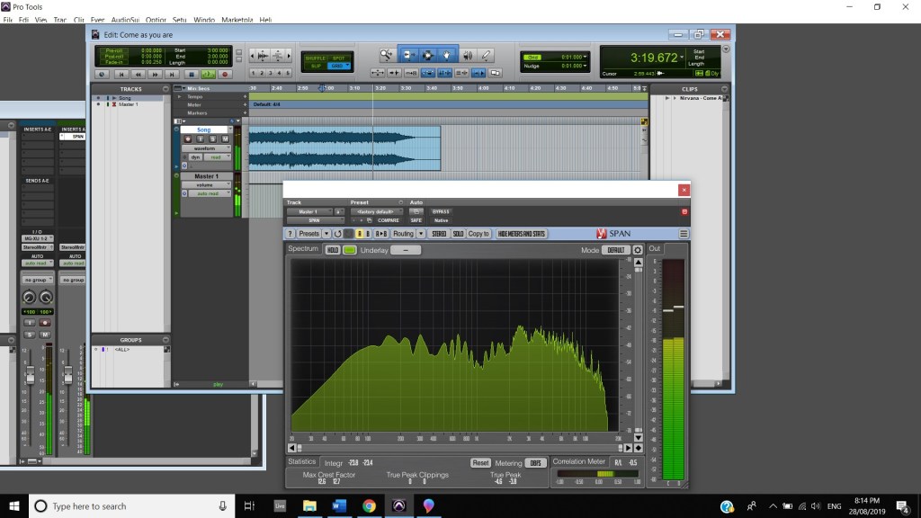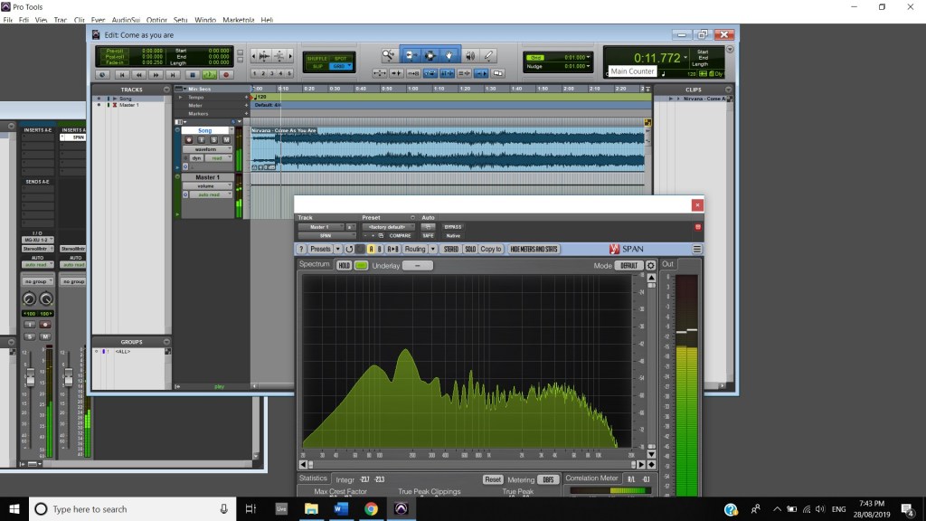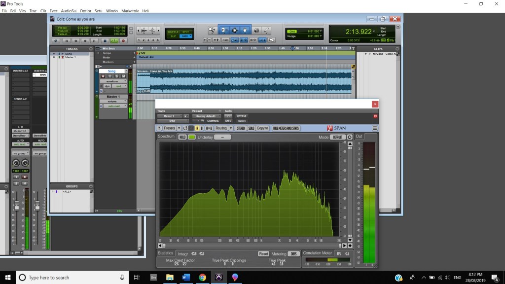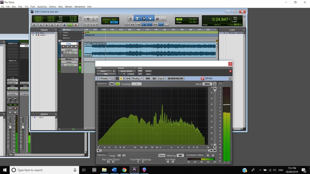 In terms of track panning, the majority of instruments featured have centred panning including, the vocals, which feature in the foreground of the mix, the acoustic guitar, which also is in the foreground and the bass, which is placed in the background. The electric guitar featured in the track also has foreground centre panning, however, during the guitar solo, 2:00 mins to 2:33 mins, there is a channel automation occurring where the instruments panning to the left channel and then to the right and so on throughout the solo. Most of the interesting track panning occurs to the drums, the snare drum is always featured in the centre of the mix, the hi hats are in the left channel, the crash cymbal is placed far in the acoustic space, and during the verses it feature in the left channel shown at 0:42-0:44 mins, then it can be heard out of the centre as well as the left channel at 0:50-1:05 mins, finally during the chorus, the crash cymbal automates between the left and right channel as shown at 1:40- 1:55 mins. The Toms also feature in the right channel and this is proven at 1:07 mins.