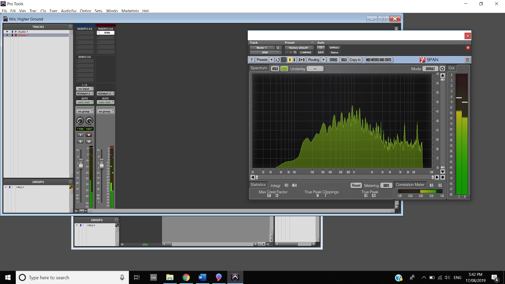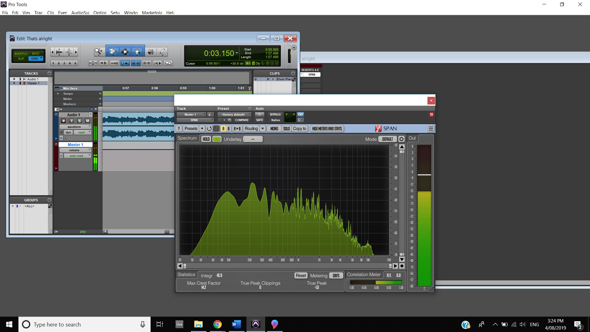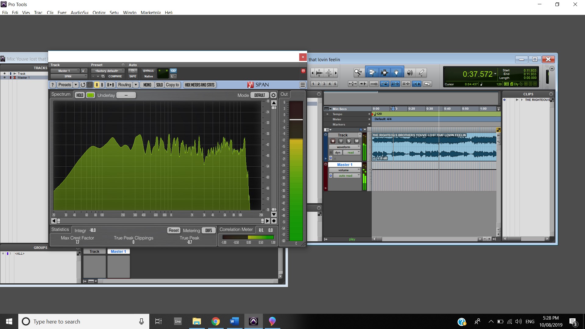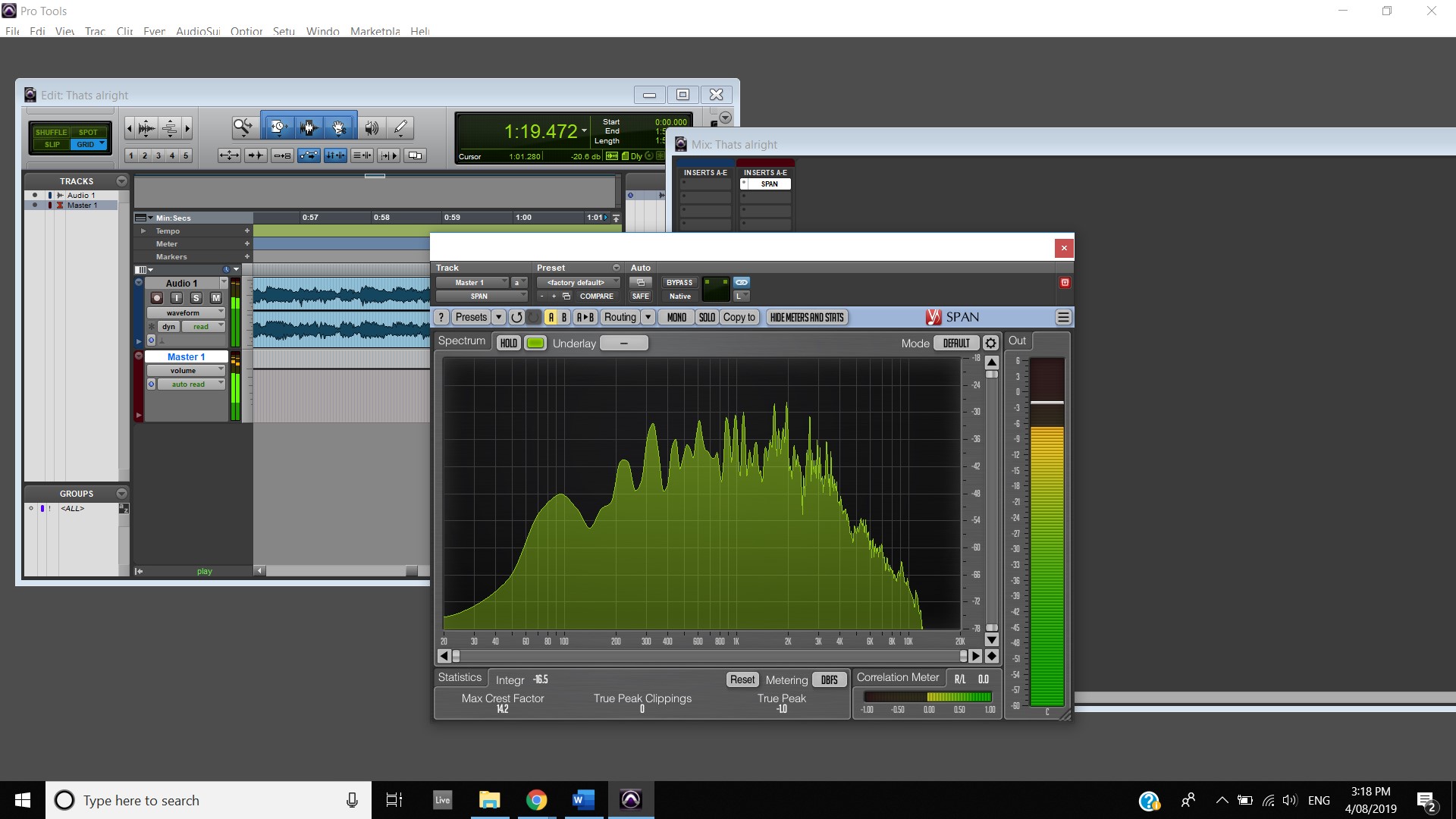 In terms of track panning, the majority of instruments featured have centred panning including, the vocals, which feature in the foreground of the mix, the acoustic guitar, which also is in the foreground and the bass, which is placed in the background. The electric guitar featured in the track also has foreground centre panning, however, during the guitar solo, 2:00 mins to 2:33 mins, there is a channel automation occurring where the instruments panning to the left channel and then to the right and so on throughout the solo. Most of the interesting track panning occurs to the drums, the snare drum is always featured in the centre of the mix, the hi hats are in the left channel, the crash cymbal is placed far in the acoustic space, and during the verses it feature in the left channel shown at 0:42-0:44 mins, then it can be heard out of the centre as well as the left channel at 0:50-1:05 mins, finally during the chorus, the crash cymbal automates between the left and right channel as shown at 1:40- 1:55 mins. The Toms also feature in the right channel and this is proven at 1:07 mins.