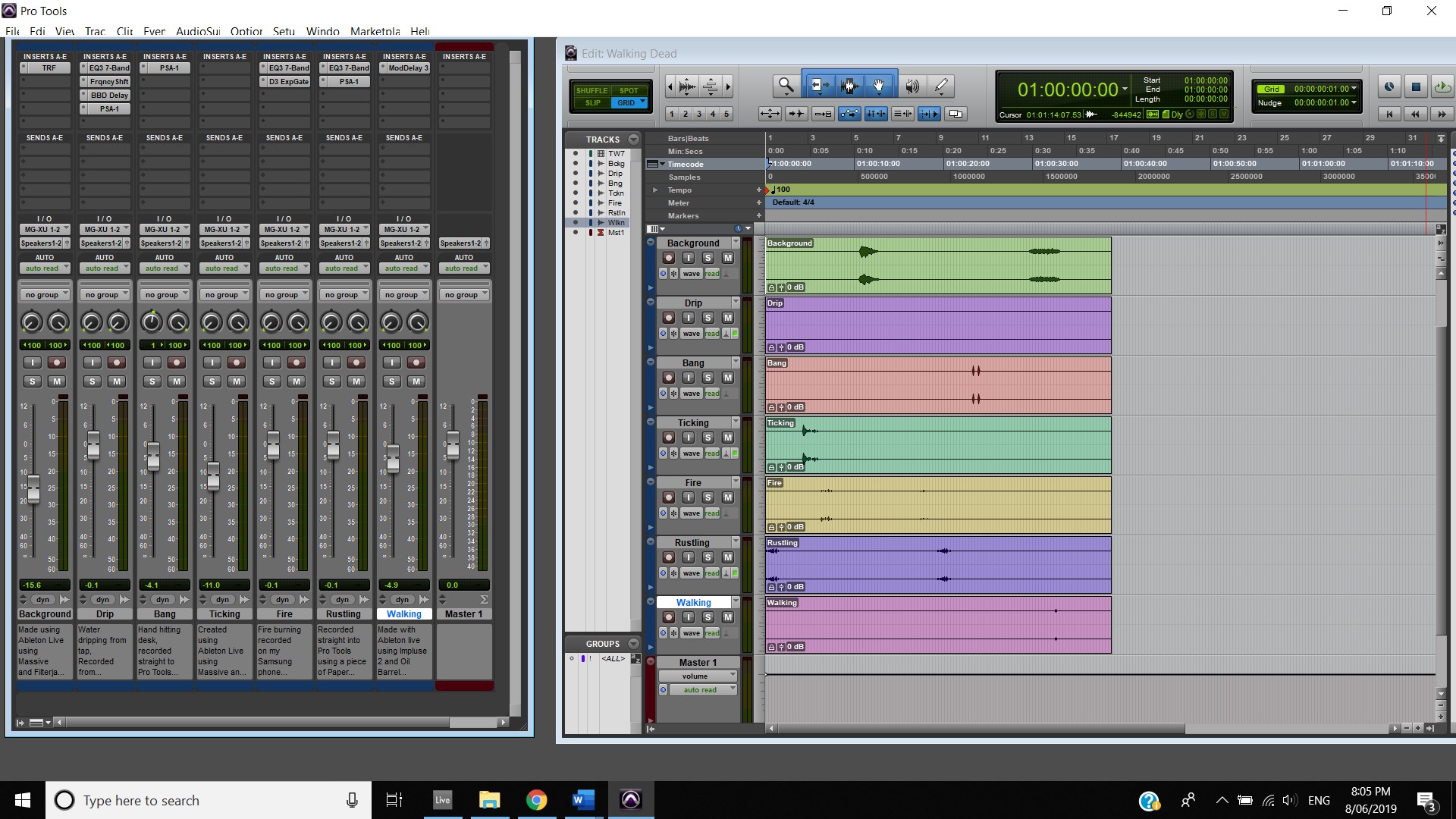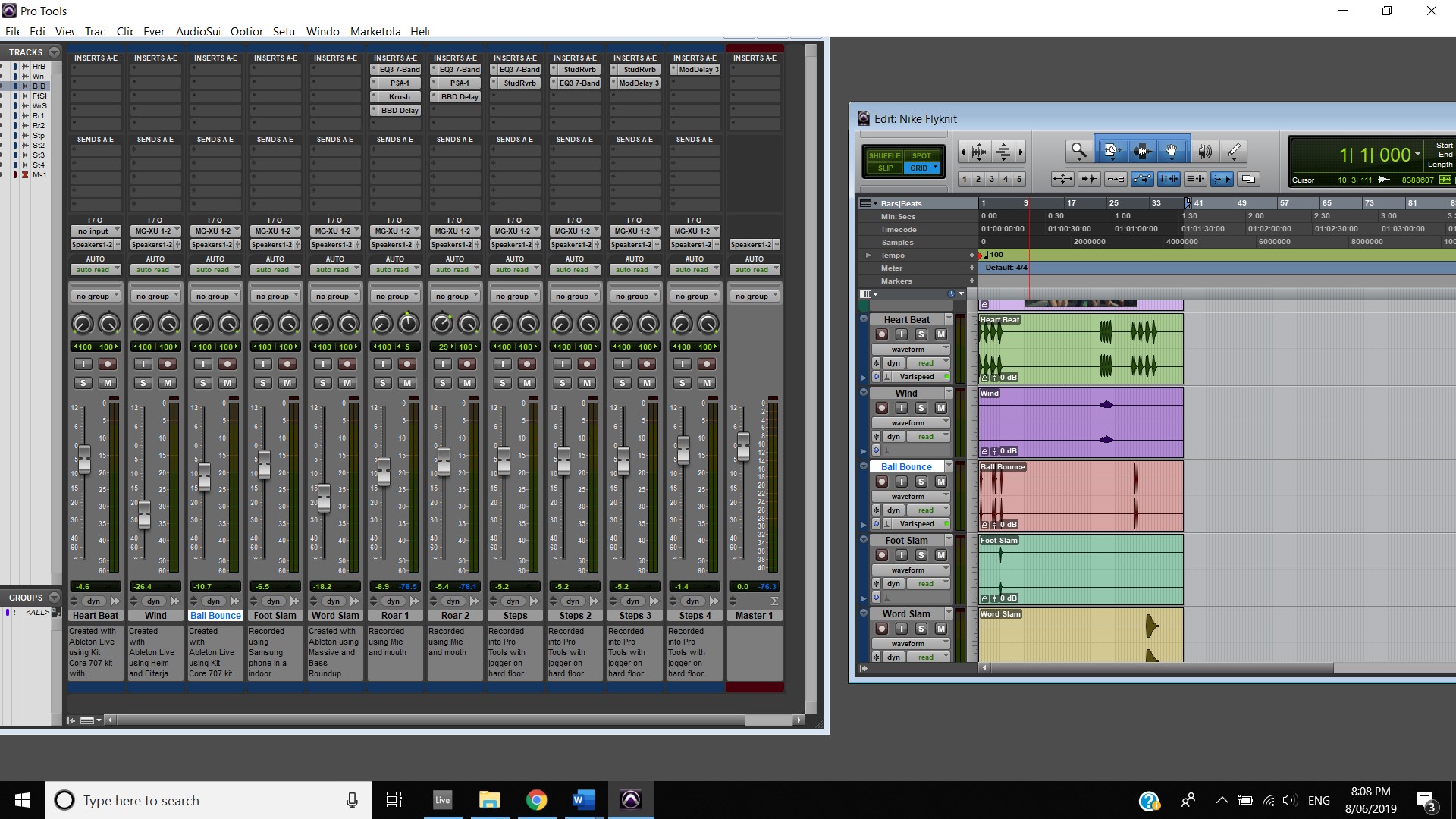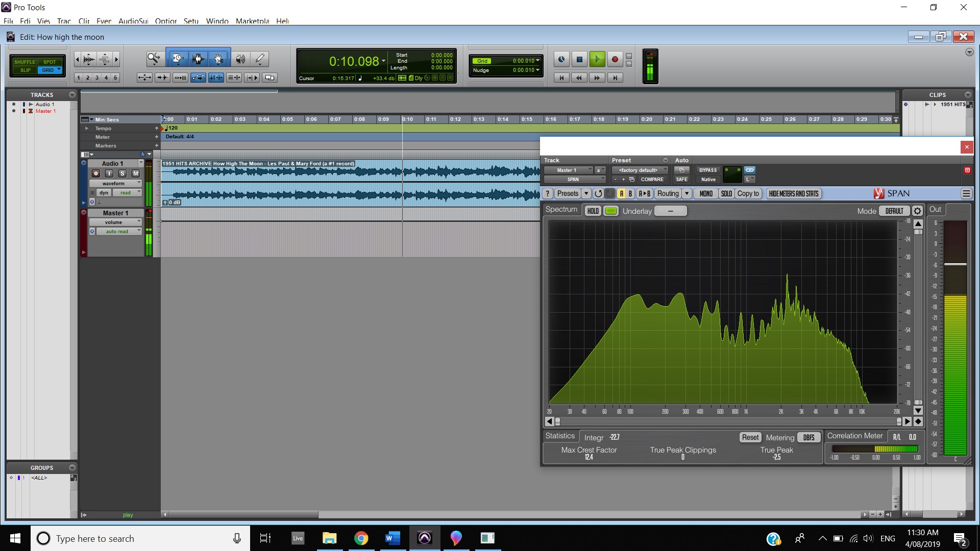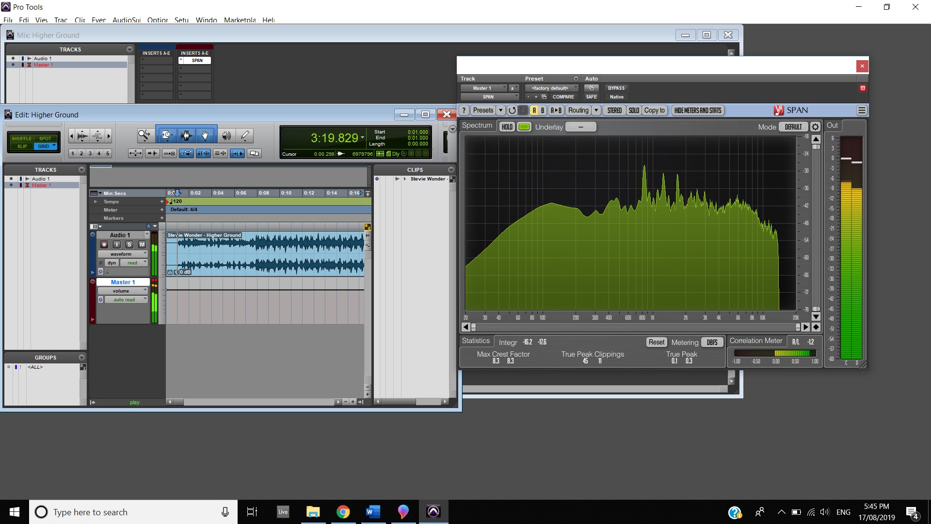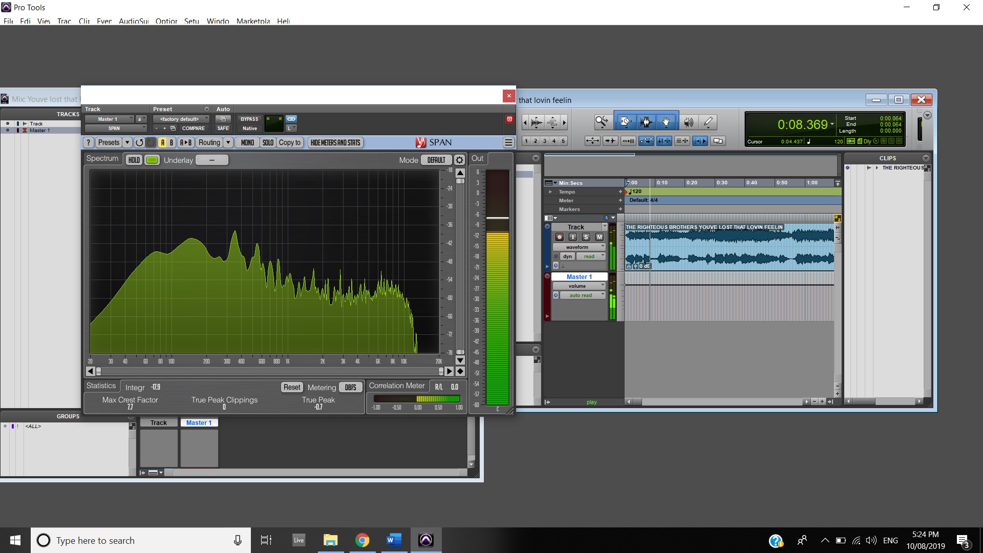 In terms of track panning, the majority of instruments featured have centred panning including, the vocals, which feature in the foreground of the mix, the acoustic guitar, which also is in the foreground and the bass, which is placed in the background. The electric guitar featured in the track also has foreground centre panning, however, during the guitar solo, 2:00 mins to 2:33 mins, there is a channel automation occurring where the instruments panning to the left channel and then to the right and so on throughout the solo. Most of the interesting track panning occurs to the drums, the snare drum is always featured in the centre of the mix, the hi hats are in the left channel, the crash cymbal is placed far in the acoustic space, and during the verses it feature in the left channel shown at 0:42-0:44 mins, then it can be heard out of the centre as well as the left channel at 0:50-1:05 mins, finally during the chorus, the crash cymbal automates between the left and right channel as shown at 1:40- 1:55 mins. The Toms also feature in the right channel and this is proven at 1:07 mins.