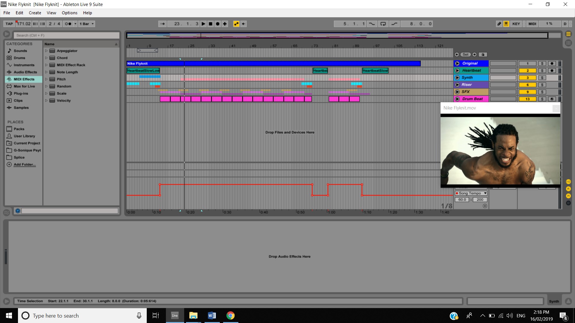 As shown on my notes I need a better plan for the walking dead video. I have just found it hard to get inspiration from a show I have never seen. I started looking for sounds, samples and some loops to use for my assessments this week and I found some really good ones that come royalty free on splice sounds. I plan on building on these as the weeks go on but this is a really good start as I will modify them to suit what my plans are for each assessment. I had one issue this week with the Nike ad as I wanted to keep the Kobe parts at 120 BPM with a heartbeat over the top but I had plans to create a Drum & Bass beat as that is what inspires me while I am running. D&B beats are normally 160-180 BPM, so I had the issue of changing the BPM throughout the middle of the video. I was unsure if this was possible but with some googling, I found out it very much was within Ableton and I fixed this issue.