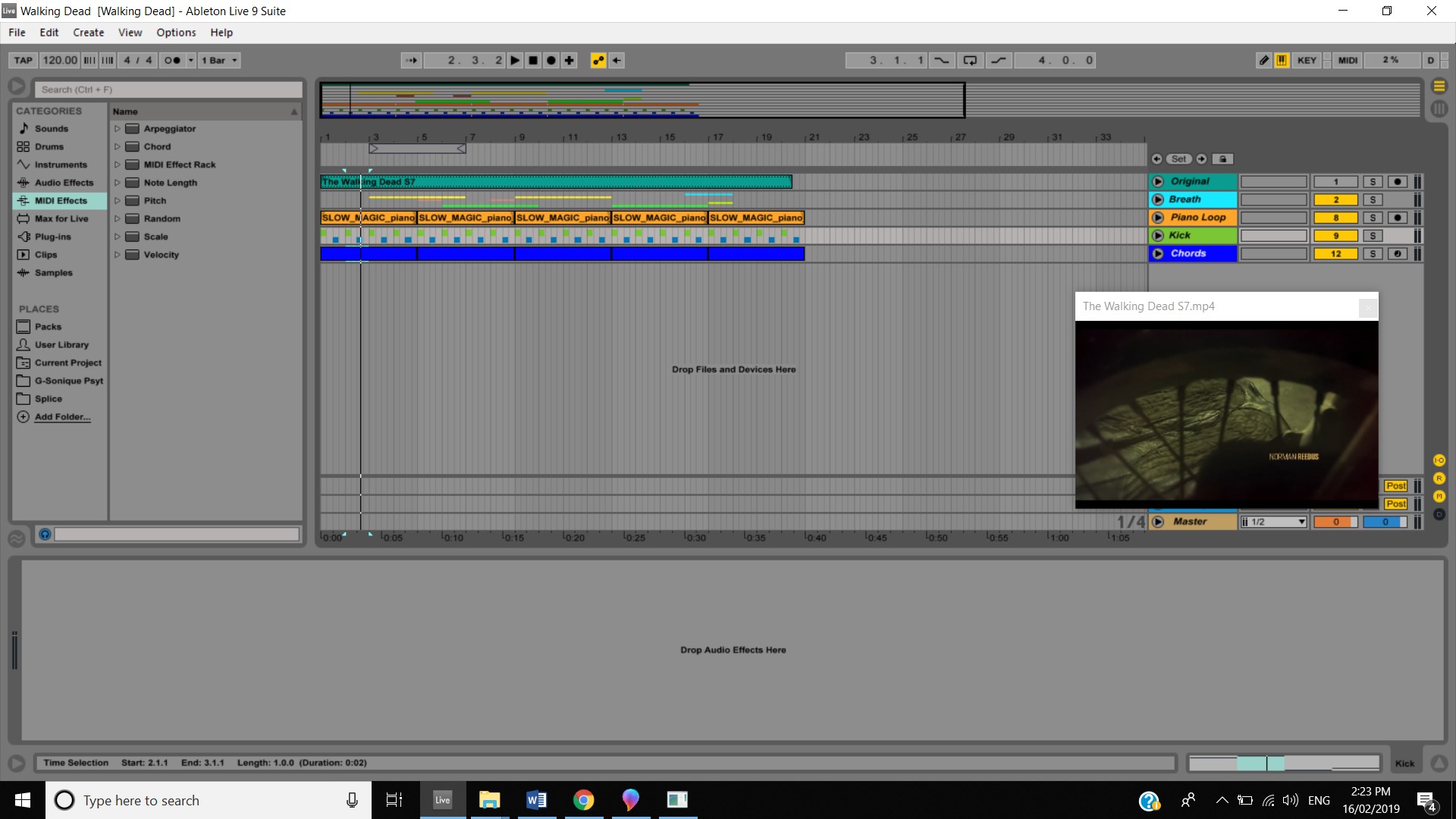 This week I also made a fair amount of progress on the Walking Dead Video. I added a previously made piano loop in the key of F min which was created by the producer Slow Magic, I also added some breathing sounds to create that feeling of isolation which works quite well with the piano loop as the loop itself creates emotion. I also added two kick drums and panned one hard left and the other hard right and placed the kicks on every second beat alternating on each one. Finally for this week I added some chords in using massive and the Dance on Glass preset which creates a eerie, isolating feeling which works well with the piano. I wish to add more parts to this and work on possibly adding more drums to this.