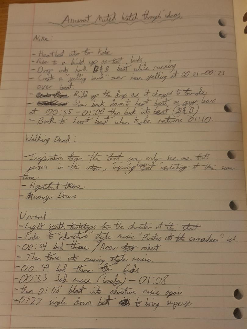 Week 2 of this topic was compositional techniques #1 and it taught how to plan out the ideas and strategy’s required for music creation. I was shown the composition of Peter and the Wolf and how different characters had a different theme and instrument. I feel like this could be used in my production of the unravel video for how the red character runs into some not so friendly obstacles. I can also see how this is incorporated into film with a example being Darth Vader and his little theme song in Star Wars. This week also discussed inspiration and how I can incorporate this into my assessment, for me being so fitness orientated I related a lot to the Nike video and as I do a lot of running myself I am inspired by what I listen to while I am running, which is mainly Drum & Bass (Netsky, Chase & Status, Pendulum etc) so I plan on recreating the feeling I get while listening to D&B while running. As recommended, I watched each video muted as to get some ideas for a direction I could go, my notes are shown below: